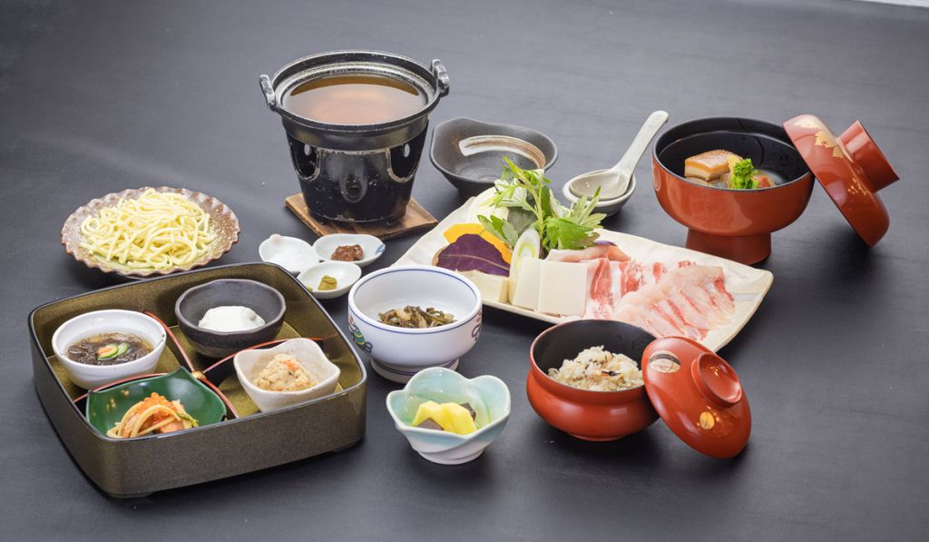 もずく酢・じーまーみ豆腐・卯の花・サーモン南蛮いくら添え・金アグー豚しゃぶしゃぶ・県産金目鯛しゃぶしゃぶ・県産野菜を取り入れた野菜盛り合わせ・らふてぃ 県産野菜炊合せ・クーブイリチー・沖縄そば または じゅうしぃ・パイナップル、黒糖寒天